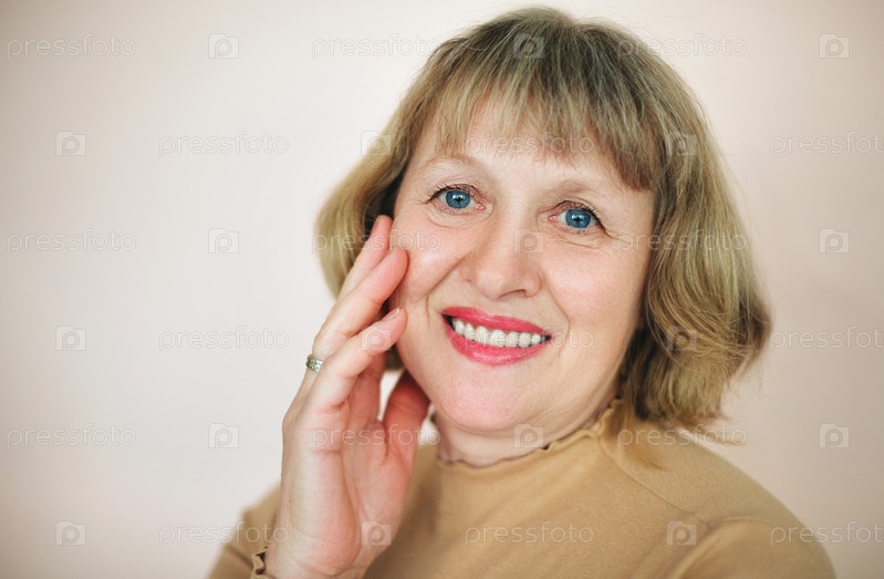 Улыбающаяся зрелая женщина трогает лицо в студии
