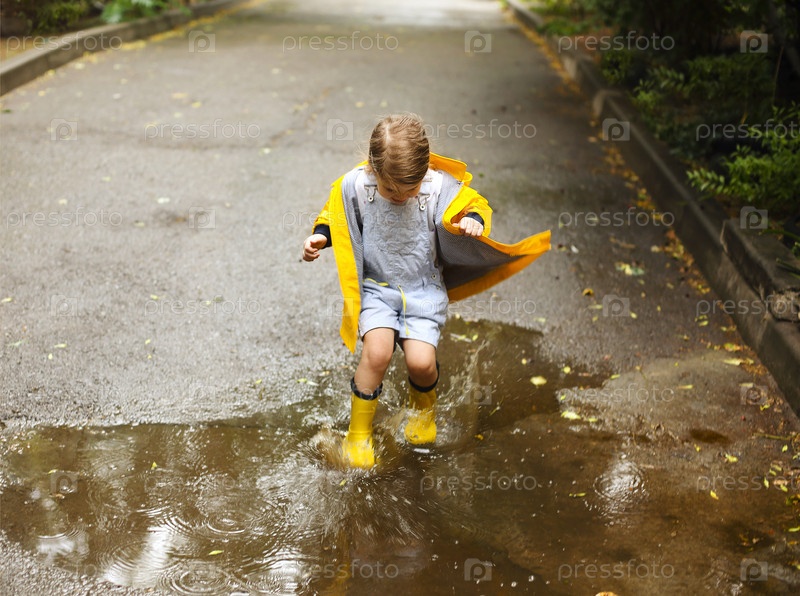 Маленькая девочка в желтых сапогах и пальто в дождливый день