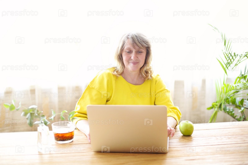 Зрелая женщина использует ноутбук дома