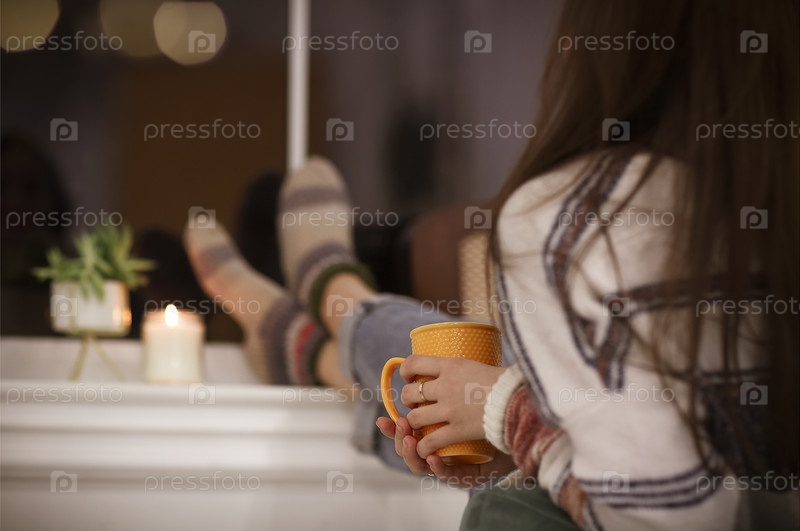 Анонимная женщина расслабляется с горячим напитком вечером