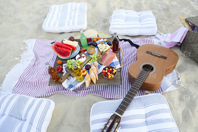 Пикник на пляже на закате в стиле бохо