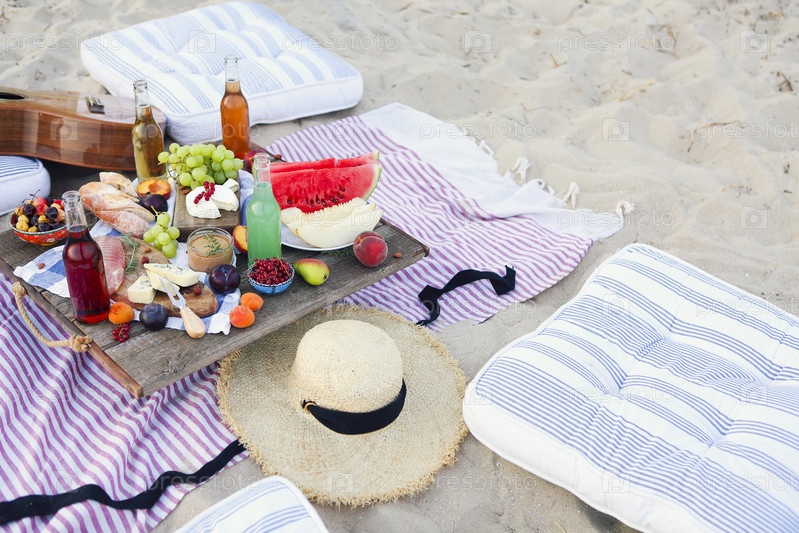 Пикник на пляже на закате в стиле бохо