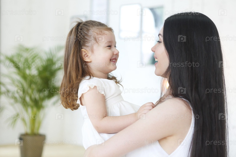Счастливая молодая яркая мать обнимает свою маленькую дочь