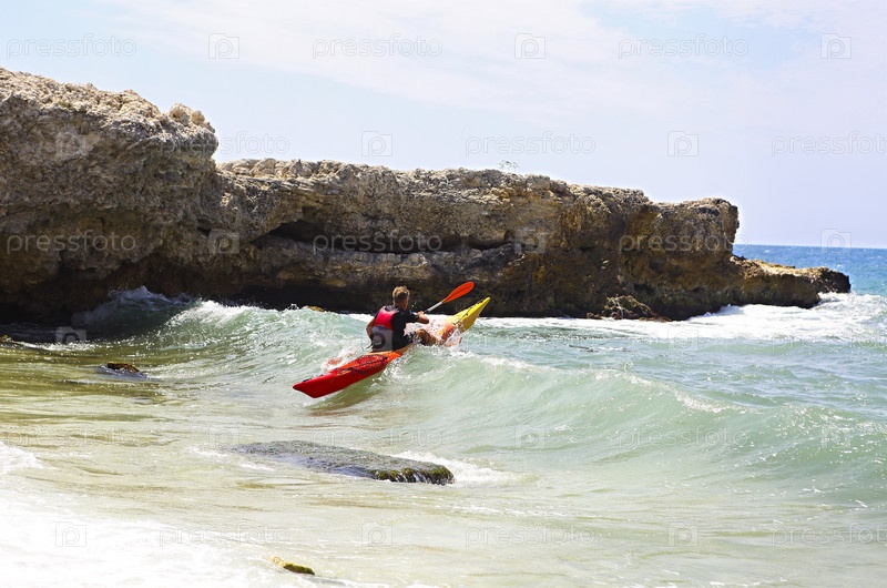 Летнее путешествие на байдарках. Мужчина гребет на каноэ на каяке, наслаждаясь развлекательной спортивной деятельностью. Мужчина гребет на каноэ с веслом, исследуя море в отпуске