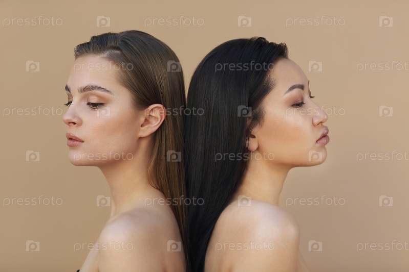 Две красивые мультикультурные молодые женщины обнимаются, позируя перед камерой