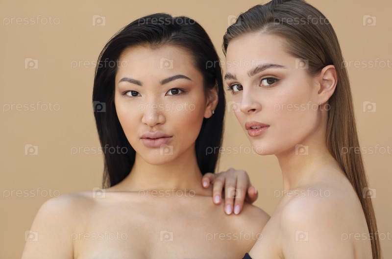 Две красивые мультикультурные молодые женщины обнимаются, позируя перед камерой