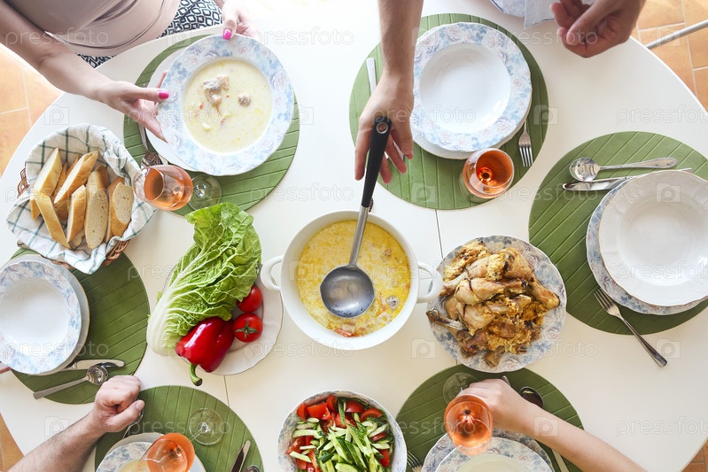 Стол с рыбным супом, салатом и курицей