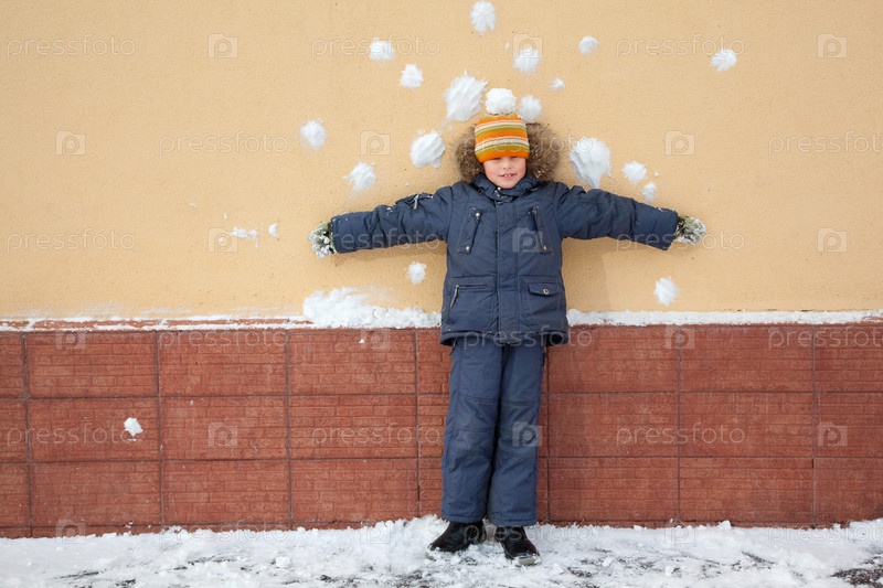 Мальчик стоит возле стены с пятнами снега от снежков
