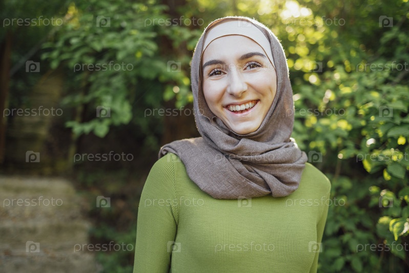 Красивая радостная школьница-подросток в красочной мусульманской одежде