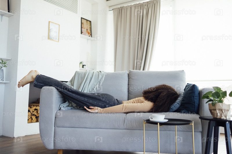 Африканская девушка в полный рост лежит лицом вниз на диване рядом со столом с чашкой кофе, чувствуя усталость после бессонной ночи