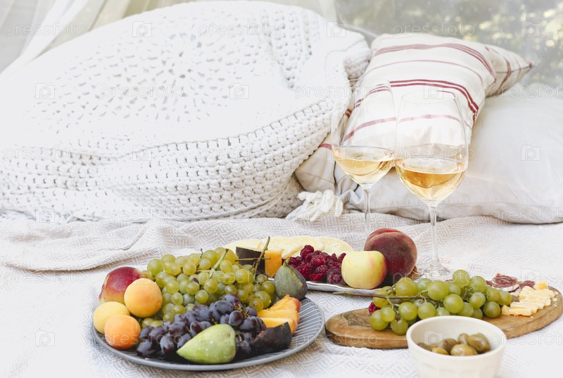 Свежие фрукты и вино на одеяле для пикника
