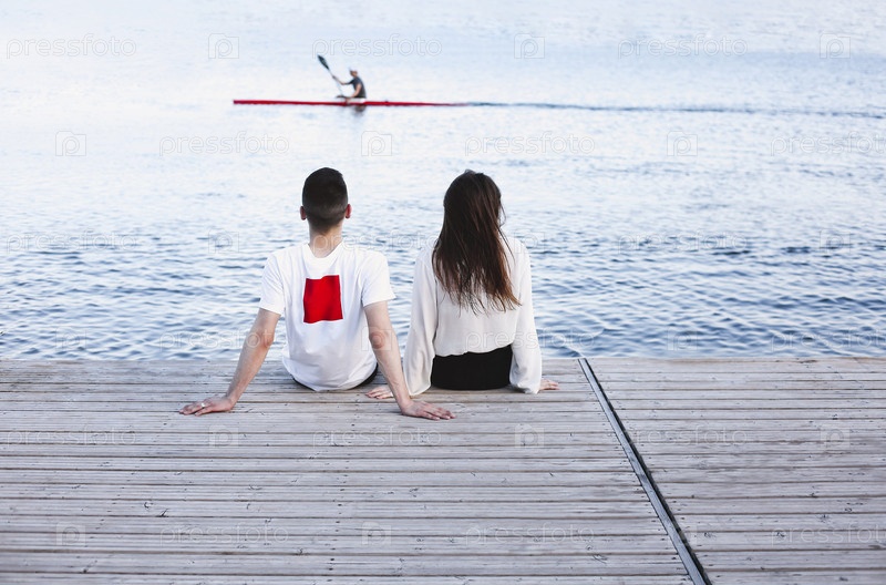 Молодая пара отдыхает на пирсе летом