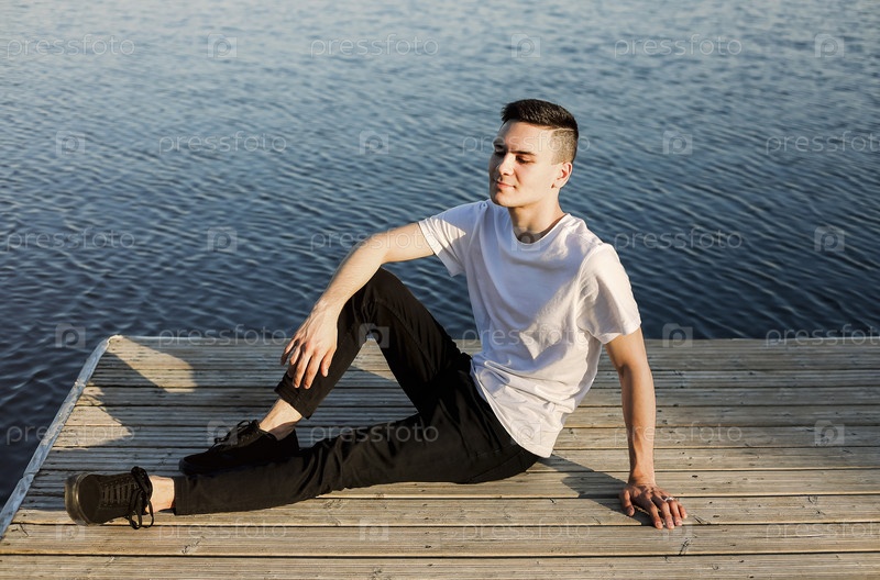 Спокойный человек отдыхает на деревянном пирсе