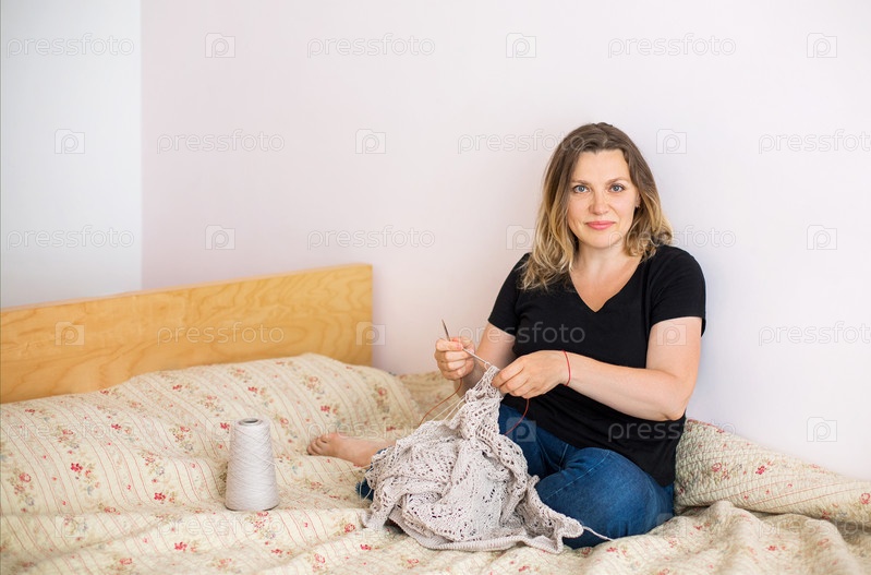 Мастерица среднего возраста вяжет дома