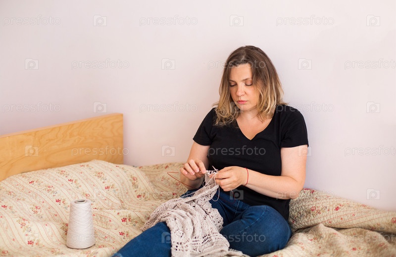 Мастерица среднего возраста вяжет дома
