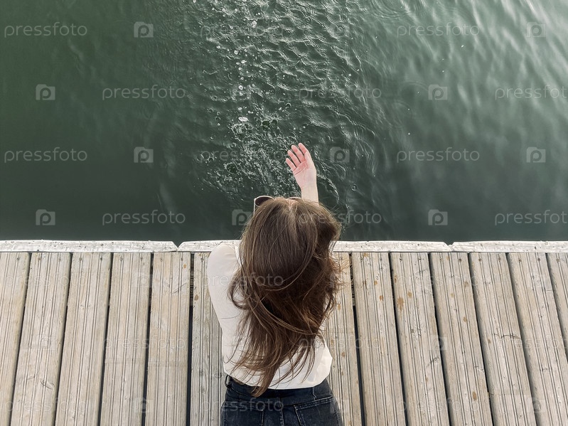 Анонимная женщина играет с водой на пирсе