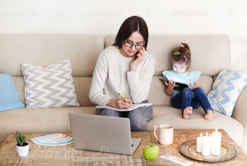 Молодая мама работает из дома