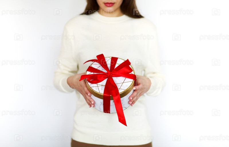 Девушка в белом свитере держит круглую подарочную коробку, перевязанную ярко-красной лентой во время празднования праздника