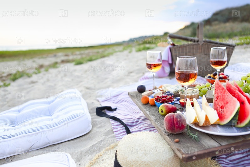 Пикник на пляже на закате в стиле бохо