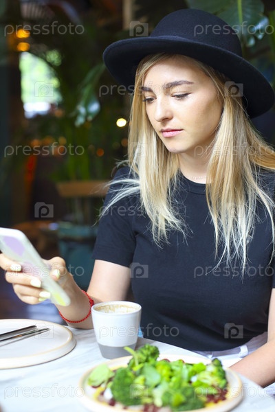 Привлекательная милая кавказская блондинка в белой джинсовой юбке, блузке и черной шляпе смотрит на мобильный телефон