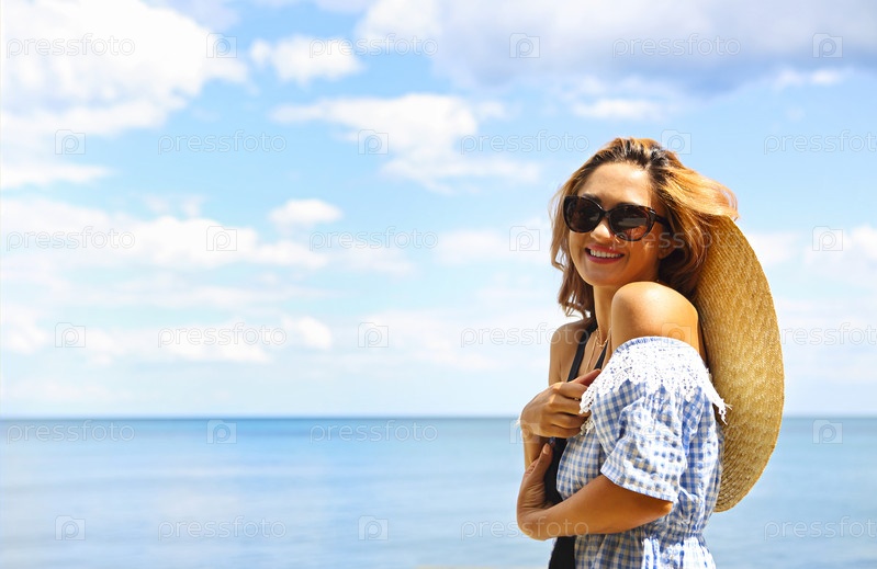 Молодая счастливая блондинка в красивом тропическом раю с видом на океан, наслаждаясь летними каникулами