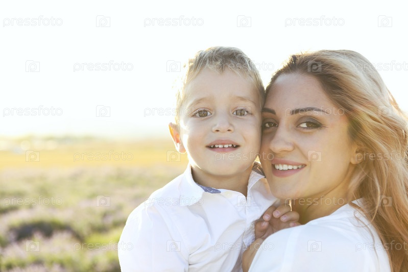 Счастливая молодая мать и малышка на лавандовом летнем поле