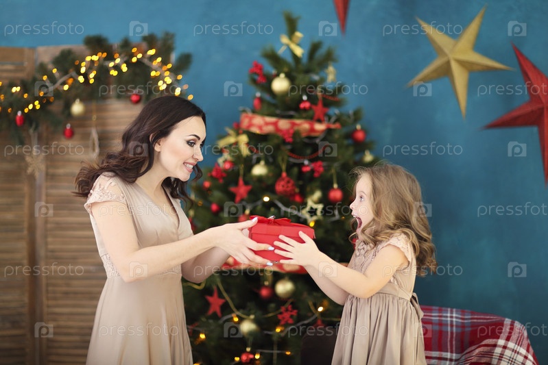 Красивая счастливая мать с младшей дочерью на фоне рождественского интерьера