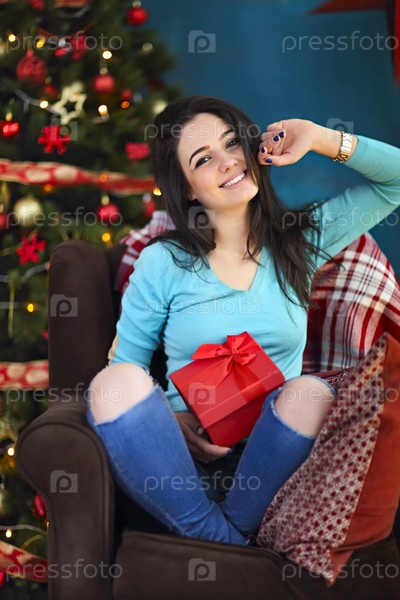 Улыбающаяся счастливая женщина с подарочной коробкой над гостиной на фоне рождественской елки. Концепция праздников и людей
