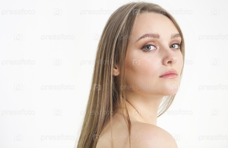 Красивая кудрявая молодая блондинка больших размеров позирует на белом