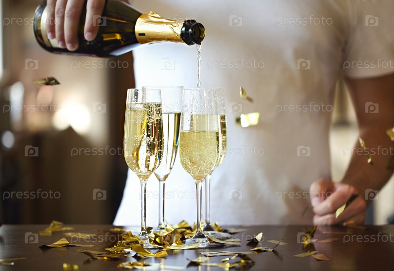 Бутылка шампанского на фоне золотой искры с золотым конфетти. Мужчина наливает игристое вино