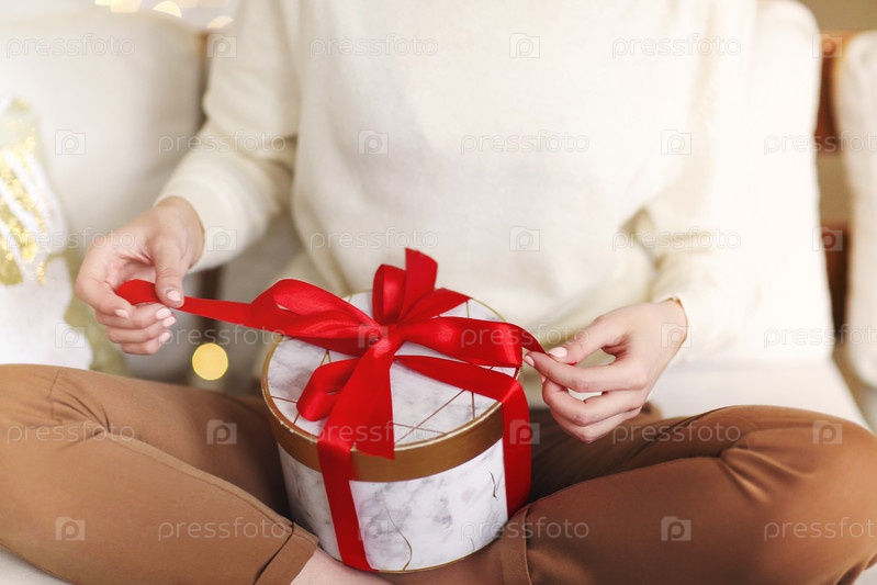 Девушка в белом свитере держит круглую подарочную коробку, перевязанную ярко-красной лентой во время празднования праздника