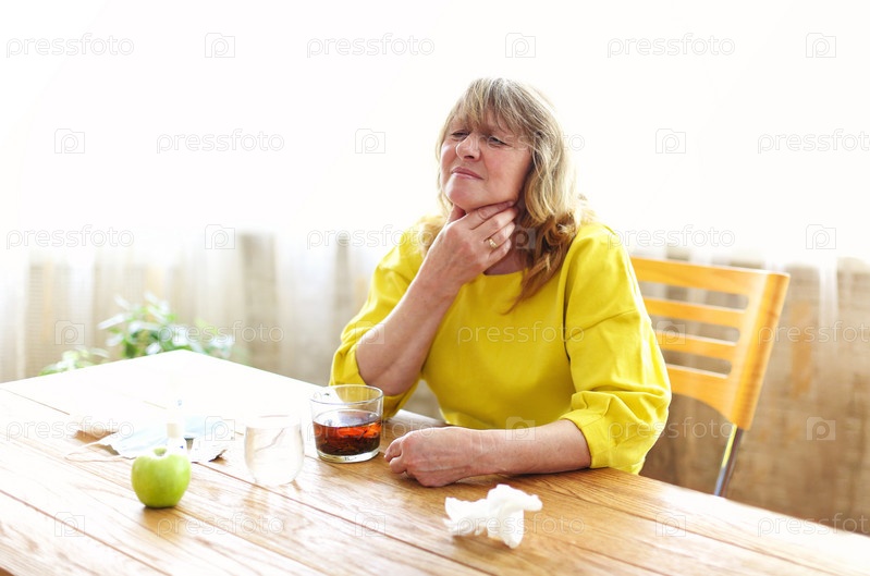 Зрелая женщина с таблетками и чашкой чая