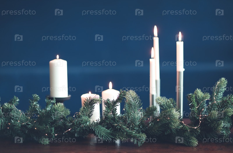 Горящие стильные свечи и еловая ветка