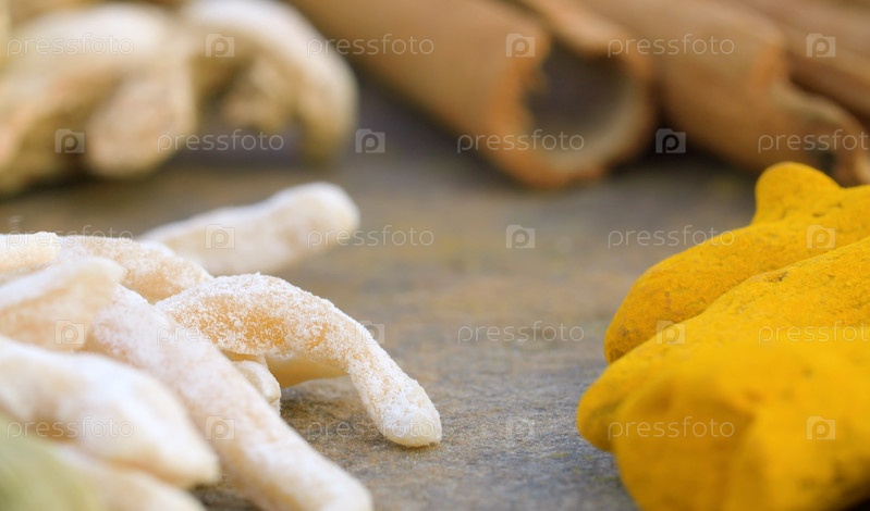 Макросъемка специй на столе. Кардамон, куркума, корица. Экстремальный крупный план