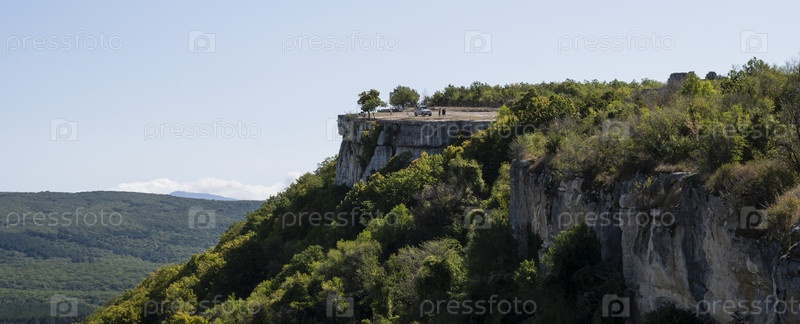 Панорамный вид на горы из пещерного города Чуфут-Кале в Республике Крым, Россия. Ясный солнечный день 28 сентября 2020 г