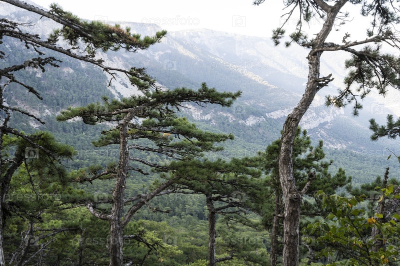 Вид на горы через деревья в Республике Крым, Россия. Вечером 20 сентября 2020 г