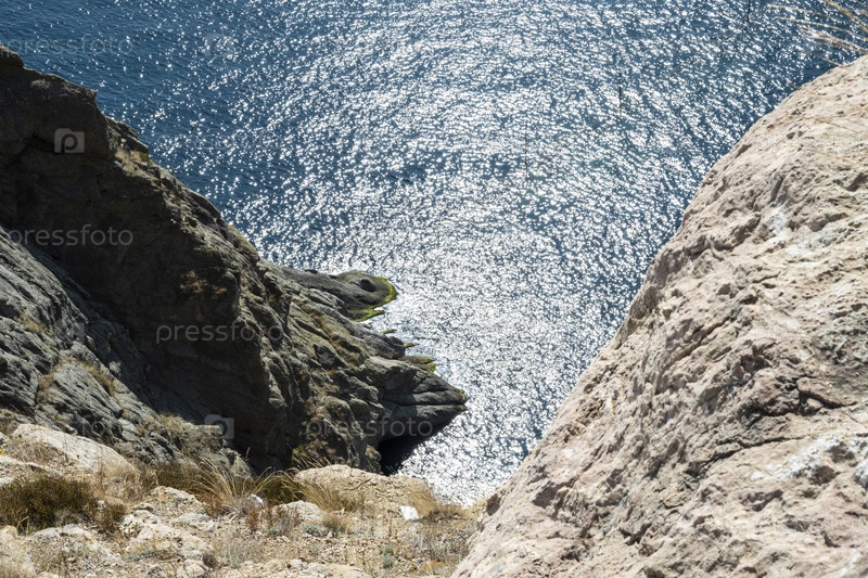 Солнечные блики на воде в море с горы Кастрон в Балаклаве, Республика Крым, Россия. Ясный солнечный день 23 сентября 2020 г