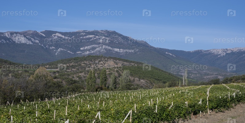Виноградники в горах в Республике Крым, Россия. Ясный солнечный день 4 октября 2020 г