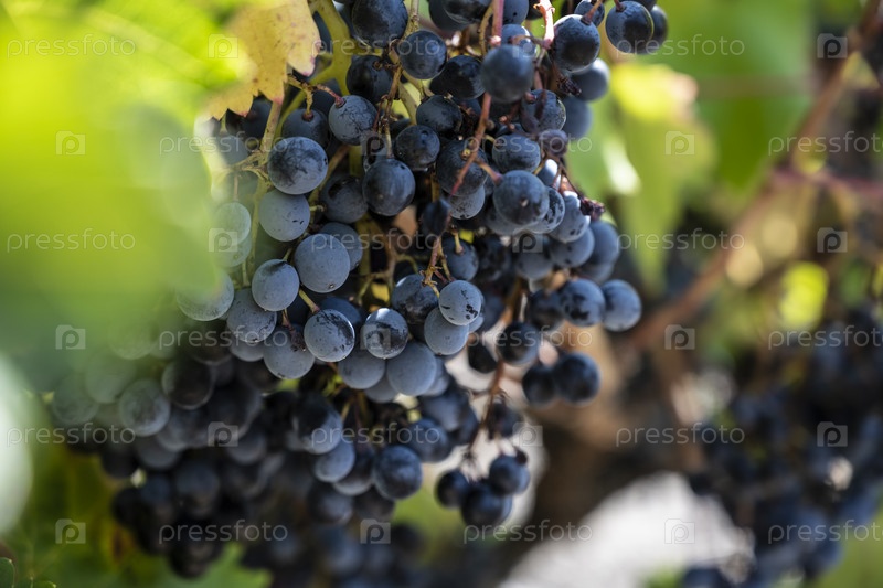 Гроздь синего спелого винограда на ветке в Республике Крым, Россия. Ясный солнечный день 4 октября 2020 г