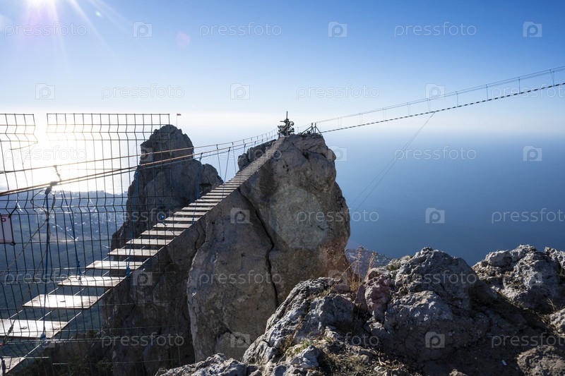 Экстремальный пешеходный канатный мост через пропасть на горе Ай-Петри. Республика Крым, Россия. Ясное солнечное утро 11 сентября