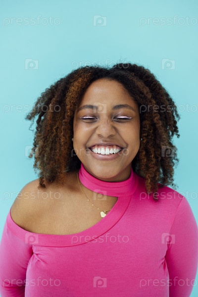 Мечтательная молодая красивая афроамериканка с яркими глазами в розовом комбинезоне