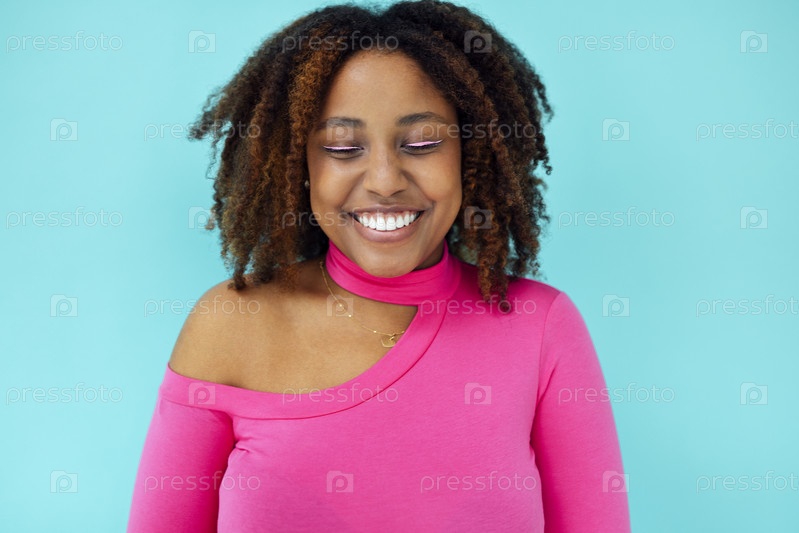 Мечтательная молодая красивая афроамериканка с яркими глазами в розовом комбинезоне