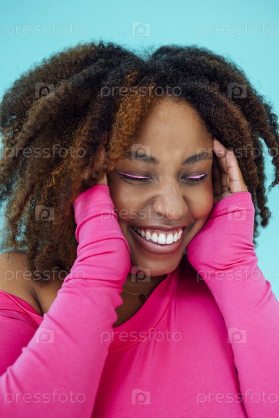 Мечтательная молодая красивая афроамериканка с яркими глазами в розовом комбинезоне