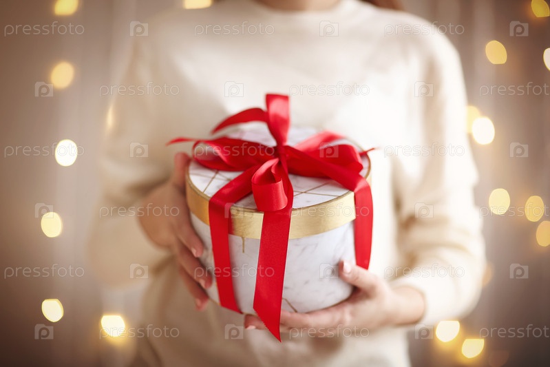 Девушка в белом свитере держит круглую подарочную коробку, перевязанную ярко-красной лентой во время празднования праздника