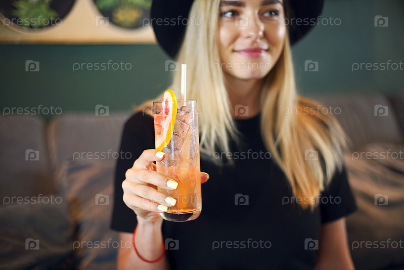 Привлекательная милая девушка в черной футболке и черной шляпе пьет холодный цитрусовый сок или лимонад