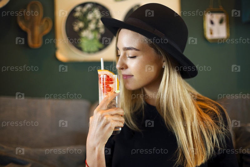 Привлекательная милая девушка в черной футболке и черной шляпе пьет холодный цитрусовый сок или лимонад