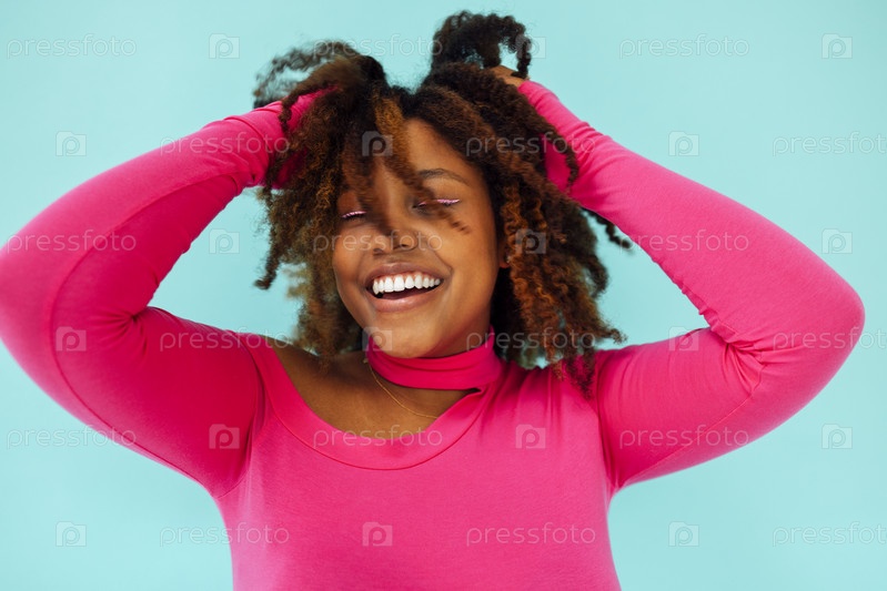 Мечтательная молодая красивая афроамериканка с яркими глазами в розовом комбинезоне