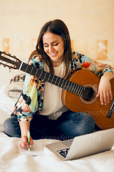 Женщина пишет песню на кровати