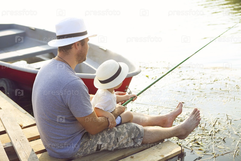 Отец с маленьким сыном ловят рыбу на берегу реки