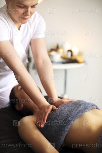 Массажист массирует тело женщины